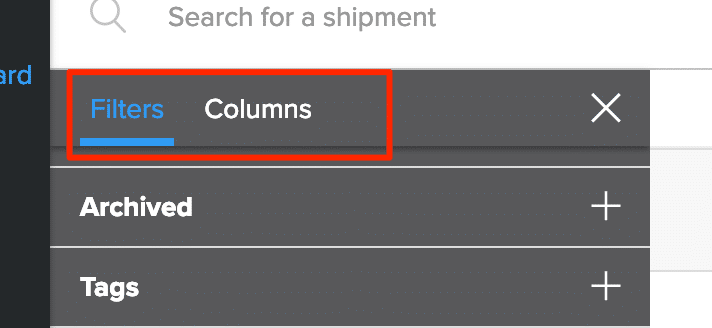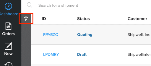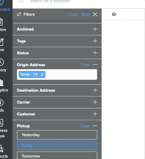 Next, you can add filters to view only the shipments fitting a set of criteria. To do this, click the toggle icon next to the filters which will take you back into the filter view, and begin adding the filters you'd like - such as those scheduled to pick up today.