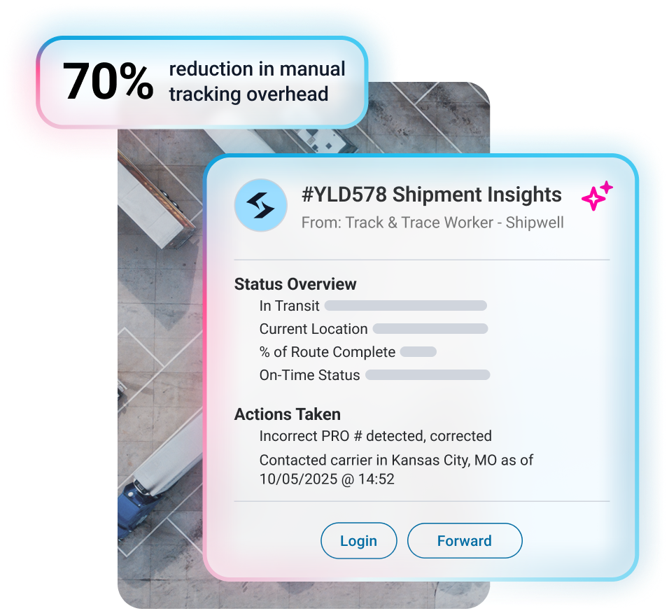 Cut overhead & prevent delays. By automating busywork and optimizing shipments, Shipwell’s AI delivers ROI, turning your TMS into an investment that pays for itself.
