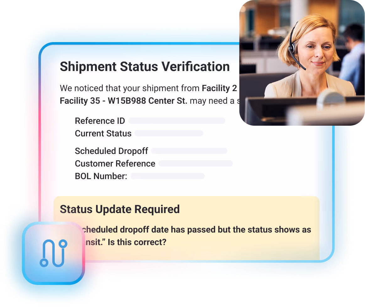 The worker continuously monitors your shipments, identifies missing or delayed tracking, and automatically communicates with carriers or drivers to resolve issues. It handles the research, follow-ups, and updates your coordinators would normally do—freeing them to focus on exceptions, carrier performance, and customer relationships.